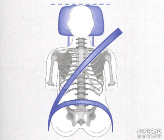 腰部安全带应当系在紧贴在髋骨的下部,与股骨部位正好接触上。在碰撞时,碰撞力作用在盆腔的骨骼上,避免安全带勒紧腹部导致严重伤害。