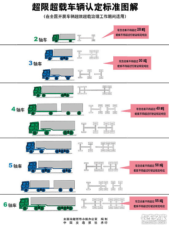 来卡车之家App【卡车之家 原创】2004年8月交通部、公安部、国家发展改革委发布了《关于进一步加强车辆超限超载集中治理工作的通知》(交公路发〔2004〕455号)简化了对车辆超限超载认定标准的规定,有利于规范执法行为。以下是其对超载超限认定的图解: