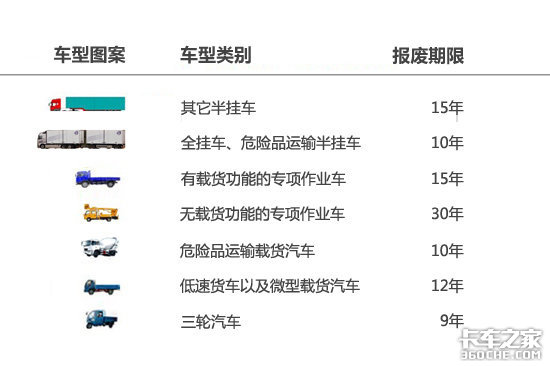 1、三轮汽车、装用单缸发动机的低速货车使用9年,装用多缸发动机的低速货车以及微型载货汽车使用12年,危险品运输载货汽车使用10年,其他载货汽车(包括半挂牵引车和全挂牵引车)使用15年;