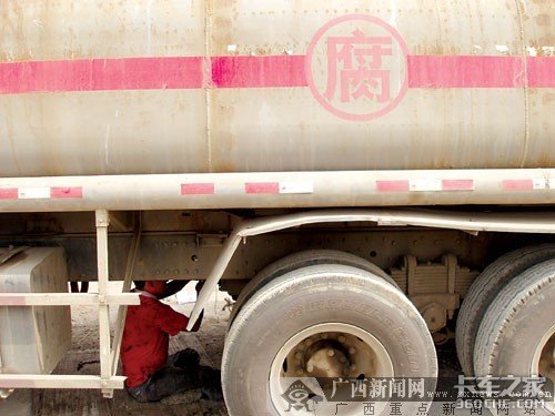 11时左右,在一家名为“河南电脑平衡传动轴”的店铺外,停着一辆标有“腐”字样的运输危险品的重型卡车,一名工人正在车底作业。一位执法人员看到该车后说:“这属于比较严重的违法行为。”