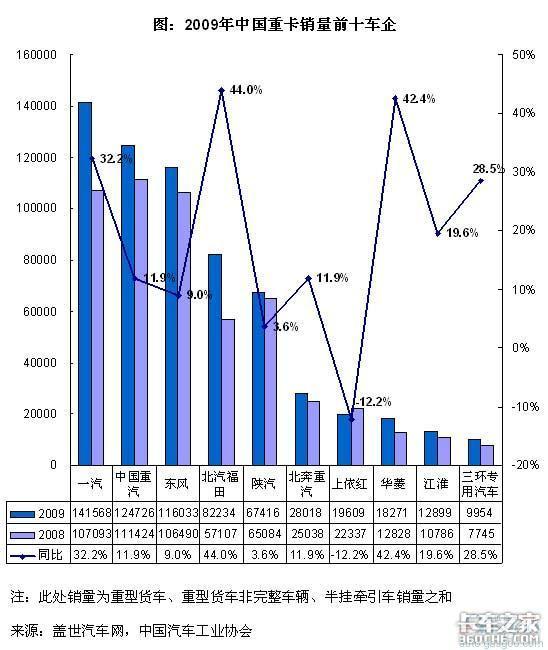2009年中国重卡行业(包括重型货车整车、重型货车非完整车辆、半挂牵引车)销量前十车企分别为:中国第一汽车集团公司、中国重型汽车集团公司、东风汽车公司、北汽福田汽车股份有限公司、陕西汽车集团有限责任公司、包头北奔重型汽车有限公司、上汽依维柯红岩商用车有限公司、安徽华菱汽车股份有限公司、安徽江淮汽车股份有限公司、湖北三环专用汽车有限公司。