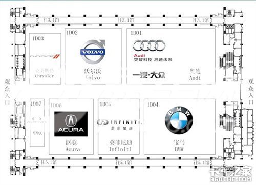 4.1号馆参展品牌:克莱斯勒、沃尔沃、一汽大众奥迪、奥迪、中欧汽车、讴歌、英菲尼迪和宝马。