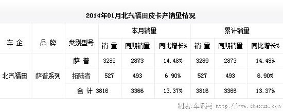 2014年1月,北汽福田汽车销售皮卡3816辆,同比增长率13.4%。萨普销售3289辆,同比增长14.5%;拓陆者销售493辆,同比增长6.9%。据了解,北汽福田皮卡可能还将推出新锐产品的同时,将加大对外出口和将市场下沉至三、四线,以夺取最大的市场份额。