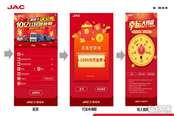 活动期间,用户只需关注“江淮轻卡”微信公众号,就可以在活动界面留下意向车型信息并领取相应车型代金券,车型覆盖了江淮轻卡旗下的帅铃、骏铃、康铃车型以及皮卡和工程车,代金券价值在1000-5000元不等,可用于活动期间购买江淮轻卡使用。