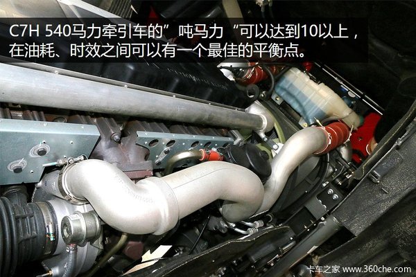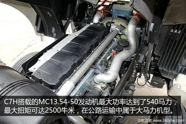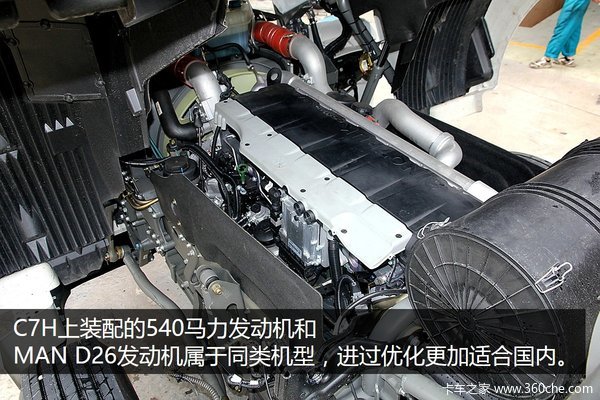 汕德卡C7H 540马力车型搭载的发动机MC13发动机和MAN原装的D26发动机属于同类产品,技术比较成熟,经过优化和改进,更加适合国内的市场。目前汕德卡C7H上装配的MC系列机型最大功率已经可以达到540马力,位居国内主流运输牵引车首列。