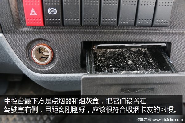 中控台最下方是点烟器和烟灰盒,把它们设置在驾驶室右侧,且距离刚刚好,应该很符合吸烟卡友的习惯。