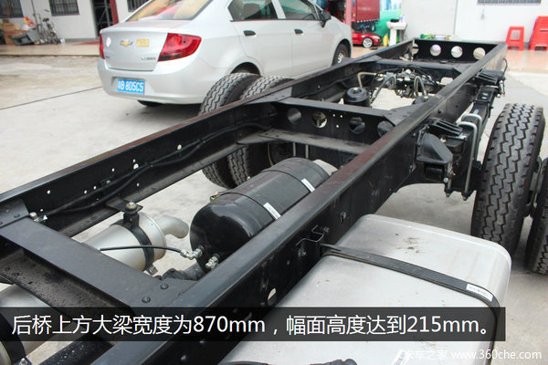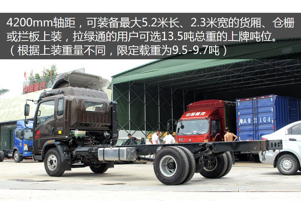 整车为4200mm轴距,可装备5米2长度的货厢或其他类型上装。专门拉粮食、水产等绿通的用户,上牌吨位可选13.5吨的限定总重,即核定载重为9500kg-9700kg(根据上装重量而定)。从865mm的车架尺寸、9/12+9的前后板簧数量、825宽度轮胎等数据来看,该车能提供足够大的承载力。