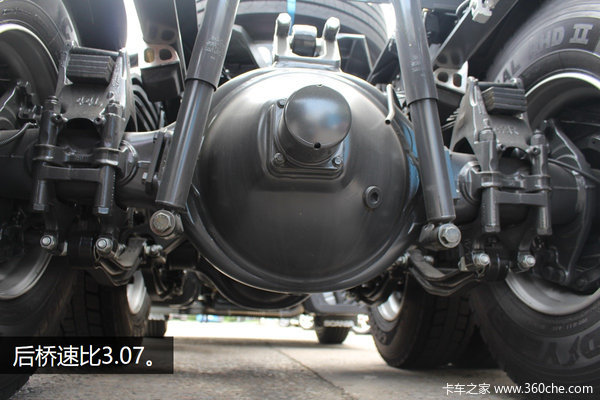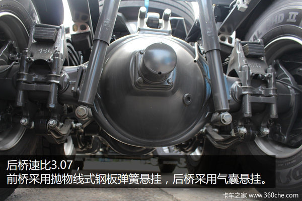 后桥速比3.07,前桥采用抛物线式钢板弹簧悬挂,后桥采用钢板悬挂。