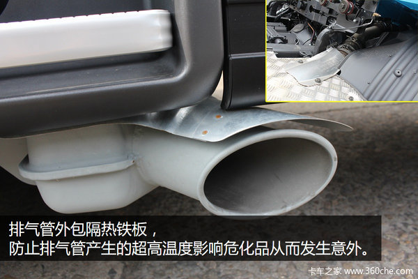 作为一台危化品专用定制车,斯堪尼亚在细节方面做了很多提高安全性的处理,如排气管外包隔热铁板,防止排气管产生的超高温度烤完周围的塑料件。