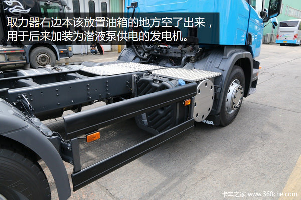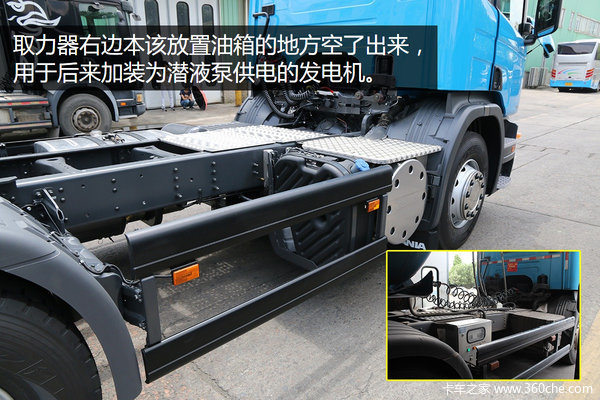 这台斯堪尼亚P400危化车就加装了发电机用于为潜液泵供电。