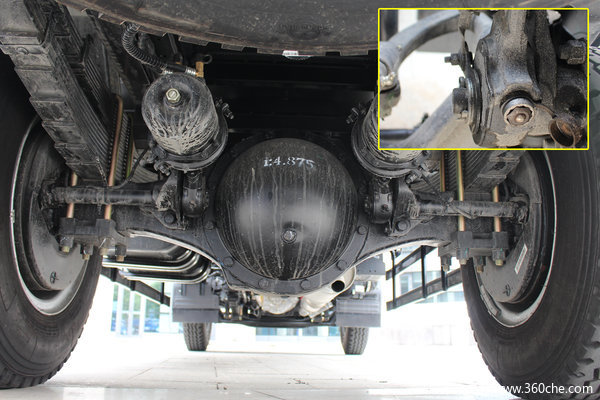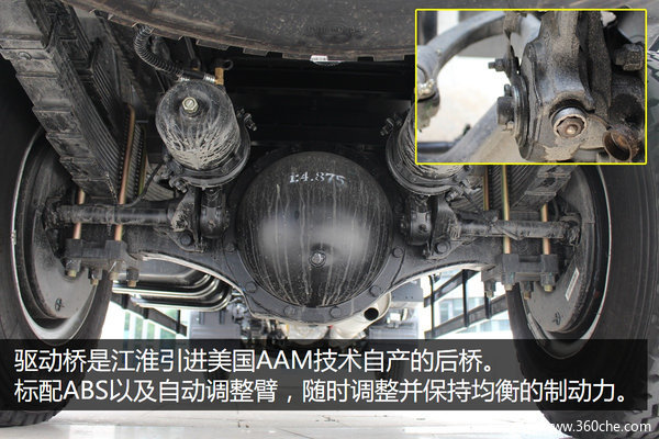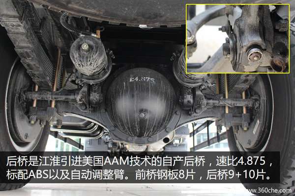 后桥采用的是江淮引进美国AAM技术的自产后桥,齿形优化,能耗损失更少,传动效率更高。另外速比为4.875,标配ABS、断气刹以及自动调整臂,自动调整臂免去定期手动调整刹车间隙的麻烦,并且还可以保证同步四轮刹车间隙,保证最均衡的制动力,另外关键部位的黄油嘴以及调整螺丝,还有橡胶防尘帽。板簧方面,前桥钢板8片,后桥9+10片,多片簧也一直是江淮风格。