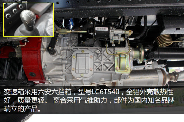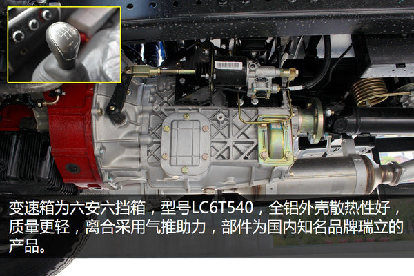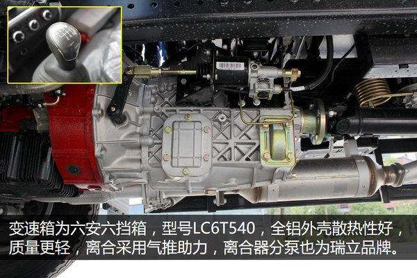 由于该车发动机最大输出扭矩达到500N.m,所以变速箱采用型号LC6T540的六安六档箱,该变速箱采用全铝外壳,质量更轻,散热性也更好。并装配瑞立的离合采用气推助力。