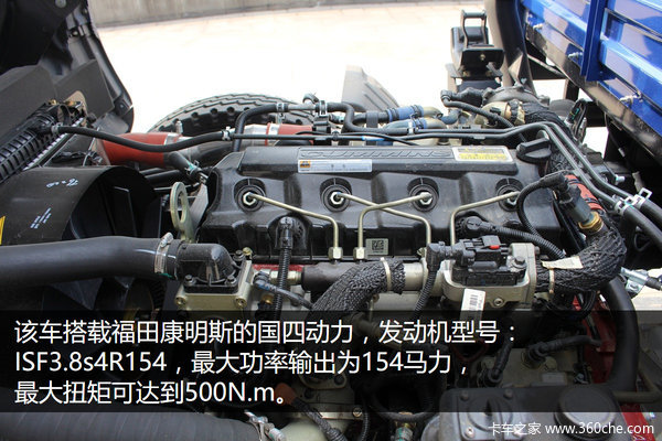 该车搭载国四排放的福田康明斯发动机,型号为:ISF3.8s4R154,该机最大功率输出为154马力,最大扭矩可达到500N.m。江淮自产的迈斯福以及锐捷特两款动力,输出分别达到158和156马力,但是扭矩只有450N.m和355N.m。