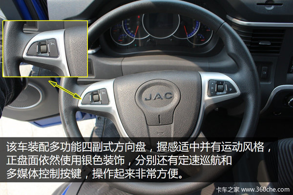 V系驾驶室正面凹凸有致,柔美中又透露着刚劲,吸睛的就是镀铬的V型进气格栅和鹰眼组合的前照灯,熏黑设计很有动感大方,并凸显JAC的品牌标示。大灯还具有照射角度可调节功能,配合整个驾驶室风格,保险杠造型也很刚劲,标配雾灯,并有下防护装置。