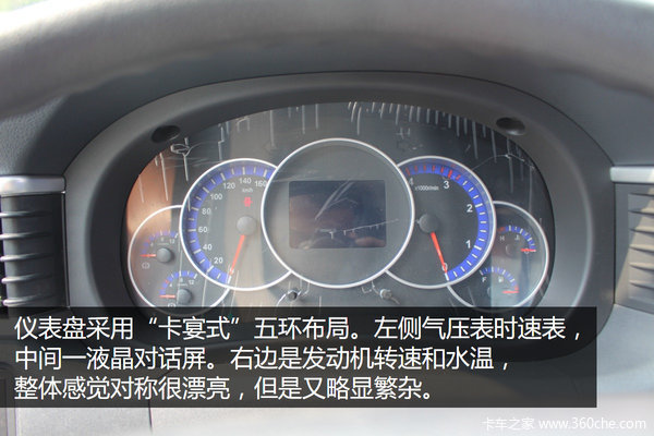 该车仪表盘也很有亮点,采用“卡宴式”五环布局,整体感觉很漂亮。左侧气压表时速表,中间一液晶对话屏,右边是发动机转速和水温,给人的第一视角美观,但实际上略有繁杂。