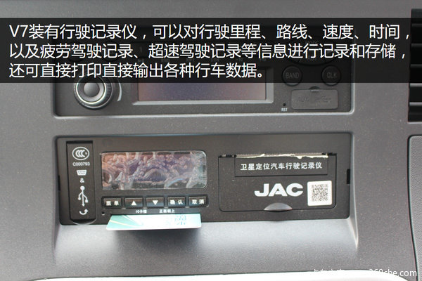 V7装有行驶记录仪,可以对行驶里程、路线、速度、时间,以及疲劳驾驶记录、超速驾驶记录等信息进行记录和存储,还可直接打印各种行车数据。