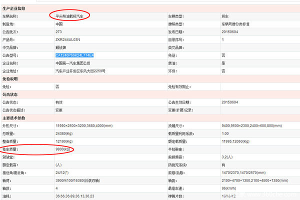 解放部分载货车的公告上有9.8吨的挂车重量