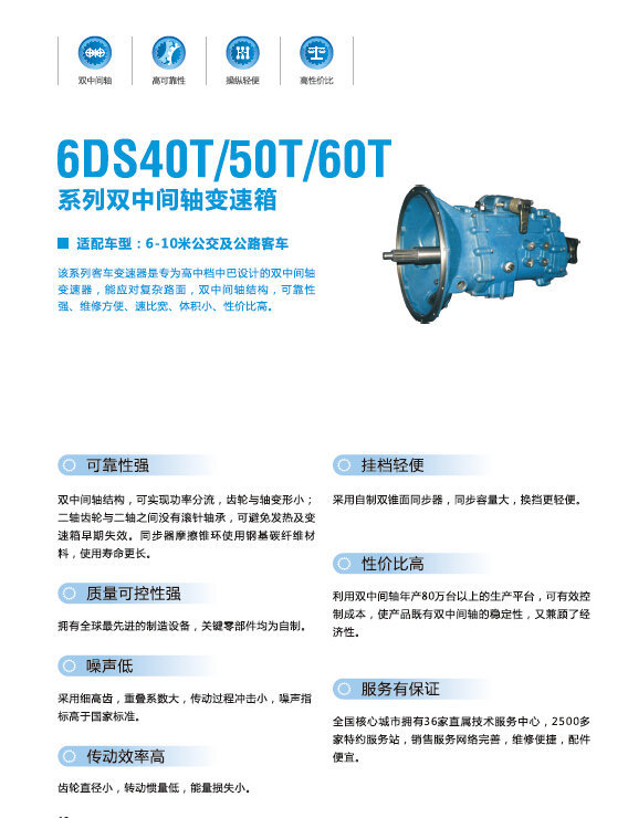 6DS系列中轻卡变速箱包括6DS40T、6DS50T、6DS60T三个型号,有直接档和超速档两种速比可选;额定输入扭矩分别为400N.m、500N.m、600N.m。