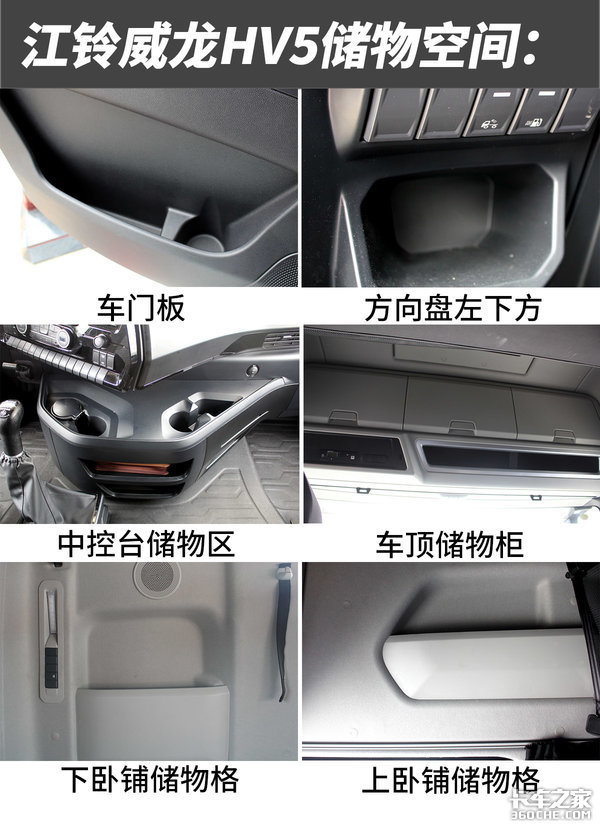 得益于该车采用的高顶双卧的驾驶室,使得它的储物空间非常丰富,比如主驾驶顶部有三大两小的储物箱、中控台下方有杯托和储物格、另外车门板、卧铺下方等等都有储物功能,据说总容量达到1033升。