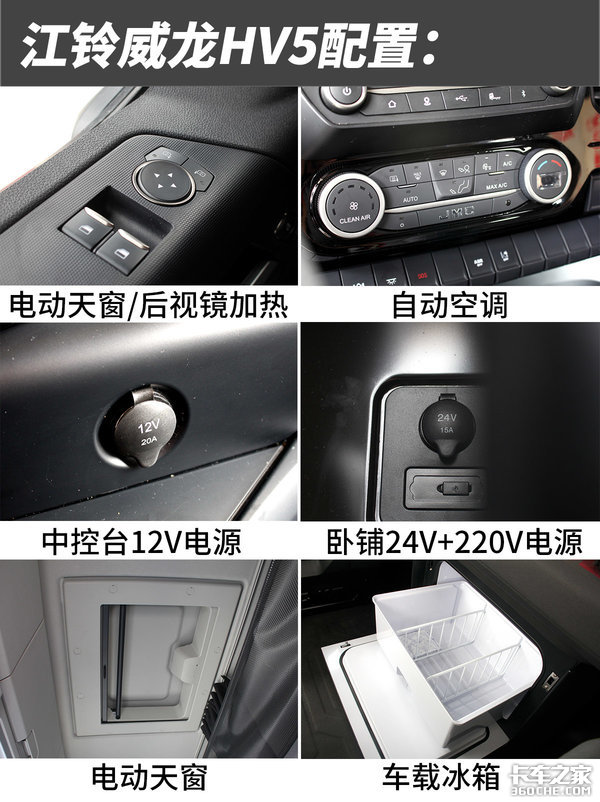 江铃威龙HV5的配置可以说是非常丰富,图中除了车载冰箱以外均为全系标配,舒适性很高,很厚道。除此之外,这款车还能选装驻车暖风以及驻车加热。更加值得一提的是,主驾驶室座椅的左下方隐藏了一个24V插口及USB、平时可方便给手机充充电。