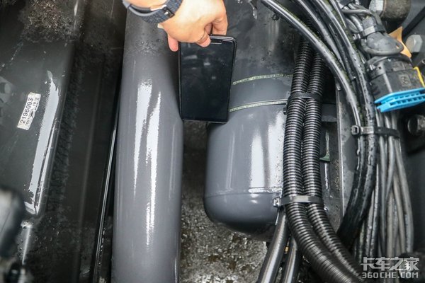 在传动轴的右侧的位置也没有浪费,安装有集成式的高压储气筒,至于安装位置,同样可以通过手机来作为一个参考。