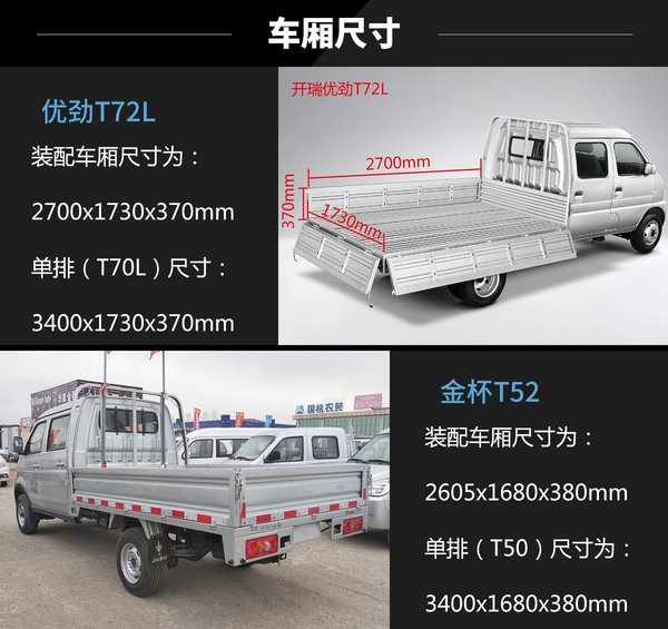 来卡车之家App从数据上看,开瑞优劲创富王的货厢虽比金杯T52矮10mm,但长度多了95mm、宽度多了50mm,装载能力会优。