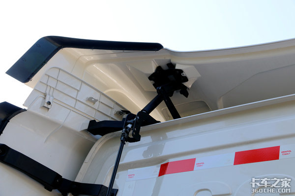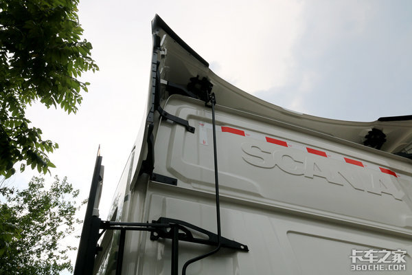 G450标配导流罩,而且左侧导流罩是可以进行折叠的,因为在欧洲挂车和驾驶室间距很小,如果导流罩不折叠很难让驾驶员进去摘取主挂车连接管路。顶部导流罩也可以根据挂车高度进行调节,这些功能还是很实用很人性化。
