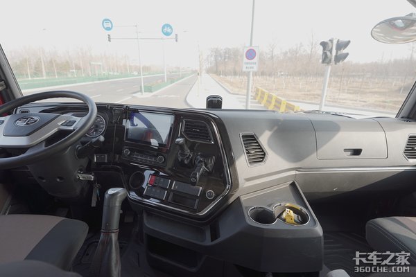 说完了中控部分的功能性,作为一台全新的平地板车型,它的空间也是非常重要的一点,刚才我们说过它的整体驾驶室进行了加高,由此带来的直接好处就是,驾驶室内的空间变化。