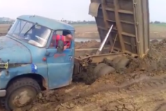 卡车陷在泥地里, 司机加大油门也...