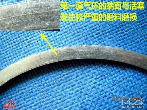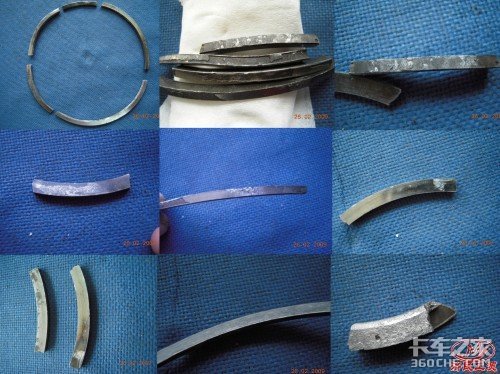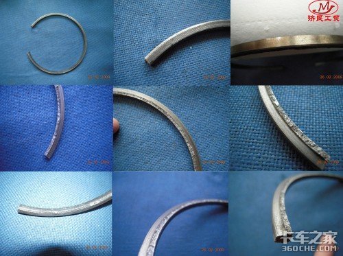 一般活塞环出现这种断裂成数段的情况比较少见(通常在不是因为气缸套支撑肩断裂的情况下;活塞环出现这种问题大部分是由于在高速、大负荷的情况下,因活塞环的环高在磨损后尺寸变小,导致活塞环出现自振频率与高速、高爆发冲击频率接近后出现共振导致断裂),但是这个事故中的第一道活塞环既有磨料磨损、熔着磨损的痕迹也有因为外力作用导致的变形区域。