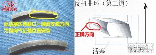 对于装有E2-3A活塞的欧Ⅱ发动机来讲,第二道气环一般选用的是反扭曲矩形环,这种结构既可以有效的减少机油的消耗量,又可以更好的提高气密性。但是此事故中的第二道气环通过观察发现其在装配的过程中出现把第二道气环装反的现象!