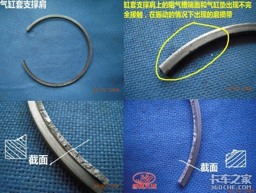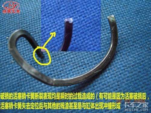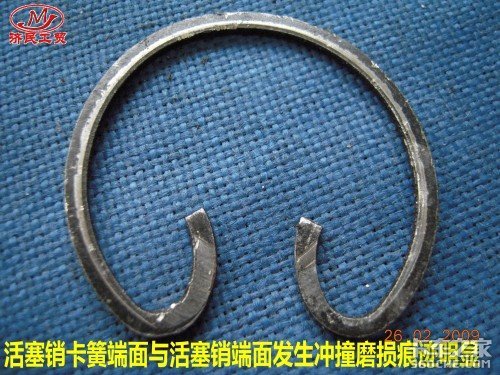 活塞销卡簧的作用就是限制活塞销的轴向蹿动。在正常情况下,因为活塞环支撑作用及气体压缩的作用,活塞相对在气缸套内属于半浮动状态;所以活塞销很少对活塞销卡簧有轴向冲击力的表现,当在活塞与缸套之间的配合公差超限或活塞环磨损严重失去支撑作用后,有一部分的分力会导致活塞销产生轴向蹿动,导致活塞销卡簧磨损。当如果气缸套破损后,活塞直接丧失导向后,这种轴向分力增大会导致卡簧严重磨损!