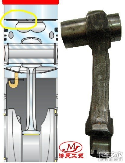 活塞上行时,因为失去支撑,在黄色的活塞残块的阻挡下,活塞会继续上行但是方向会发生改变,极有可能和缸体的缸套承孔发生挤压,因发动机的缸套承孔与缸体水道之间的组织结构在相邻的两个气缸之间(轴向)最薄(强度低)所以,一般发生挤压破损的位置都大部分在轴向方向,当残余的活塞连杆组被曲轴带动继续上行受阻后,连杆发生轴向弯曲。