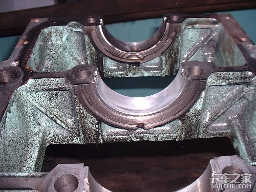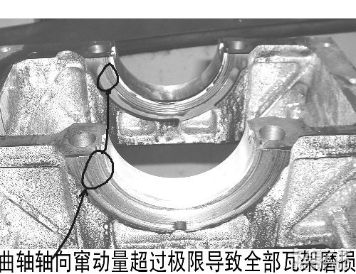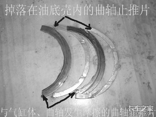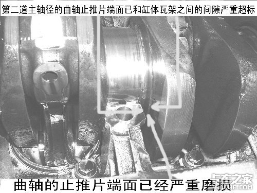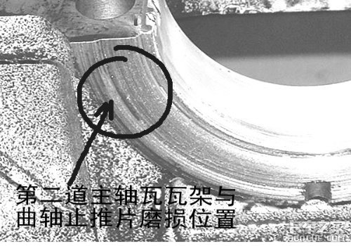 1、上下缸体曲轴止推片的安装端面(朝向飞轮方向)均被曲轴磨损;有一对曲轴止推片掉入油底壳。