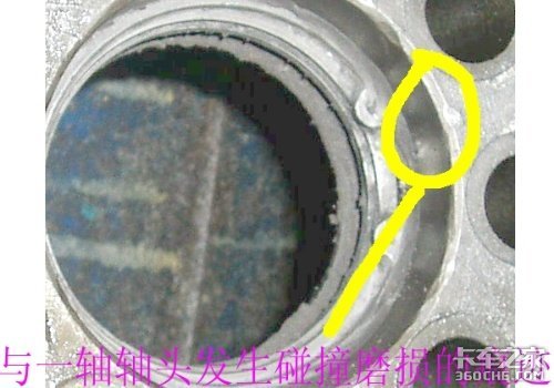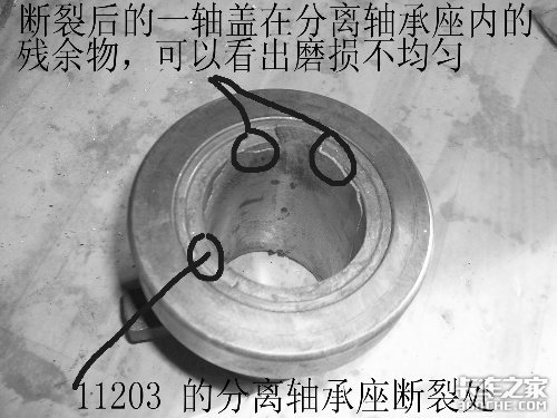 5、11203的分离轴承座从分离轴承的工作端面处断裂;内部可以看见F91409一轴盖的磨损残余部分。