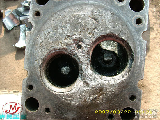缸盖的工作面被气门阀体的残渣顶坏,气门在气门阀体和气门杆结合处断裂。