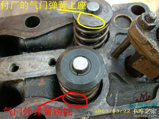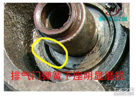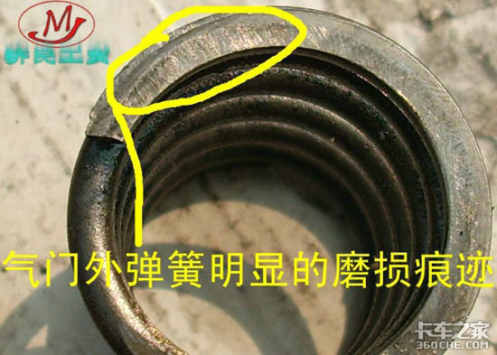 气门弹簧上有明显的磨损痕迹(上图),气门弹簧下座也同样磨损严重(下图)