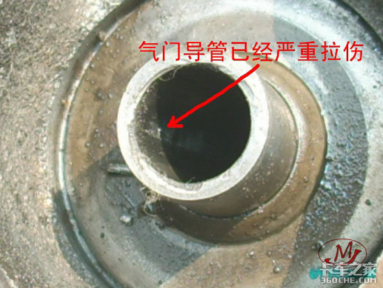 3、观察拆卸完的气缸盖,发现其气门导管内径已经严重拉伤: