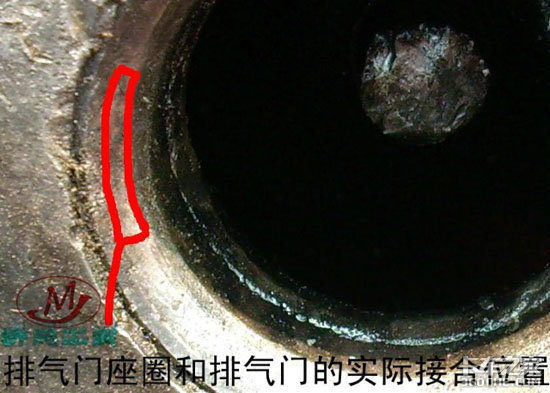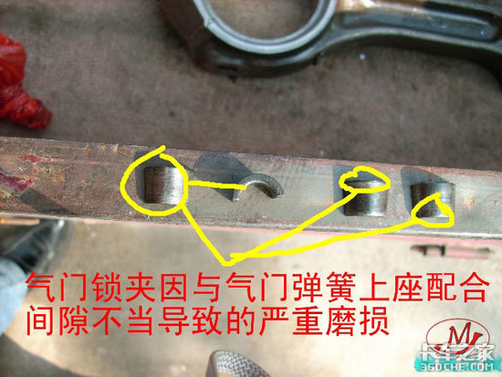 此台发动机的气门外弹簧的自由长度已经小于规定的64.5mm,而且差值超过的1.5mm的最大极限。气门的锁夹槽的磨损较大、气门锁夹磨损、气门弹簧上下座磨损严重;气门座圈磨损严重,以上因素是直接导致此台发动机捣缸的直接因素。