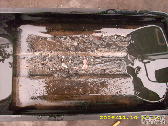 1、油底壳内可以见到发动机缸体的残渣及一片铜合金物品。