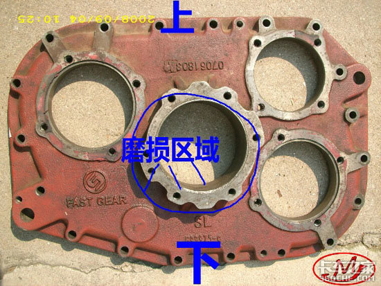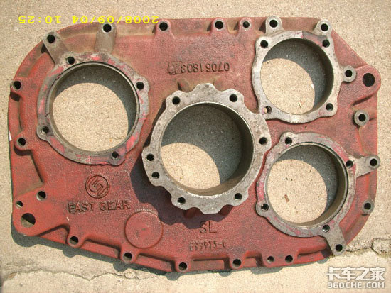 2008年09月04日,我单位受理一起法士特变速箱后盖(型号为:F99975)早期损坏的事故。变速箱在更换后盖后使用较短时间出现变速箱组合轴承外圈滑转,油封漏油。因客户没有提供全部的损坏部件,我们只能根据客户提供变速箱后盖及相关口述,组织有关技术人员进行事故原因分析: