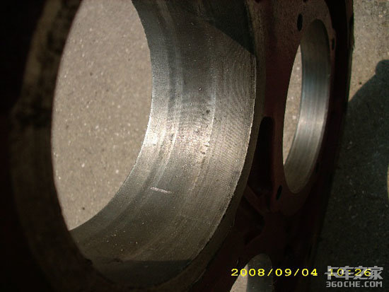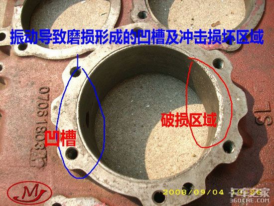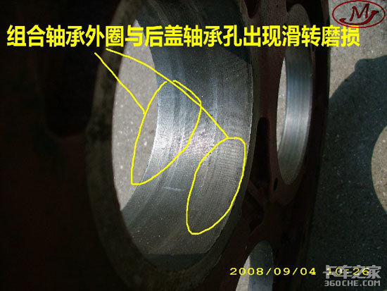 后盖的组合轴承承孔出现磨损,组合轴承的外轴承外圈定位台肩与后盖壳体出现冲击形成凹槽和磨损区。