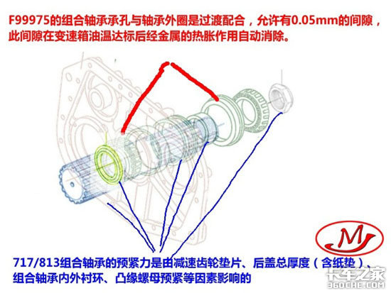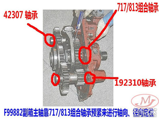 因副箱主轴同样属于浮动轴(虽然717/813组合轴承可以起到轴向、径向定位)但是其前部完全依赖由42037轴承及192310轴承支撑的加长中间轴来进行浮动定位,也就是说如果这两套轴承出现磨损,副箱主轴就有出现定位偏差(径向跳动超标)的可能。