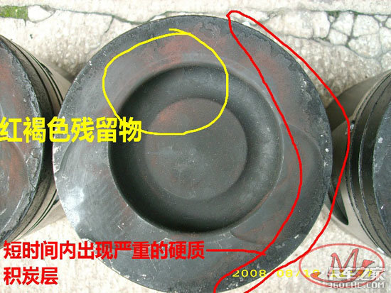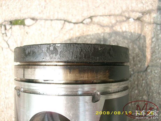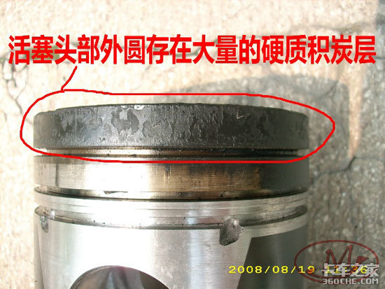 活塞头部在第一道活塞环上方外圆有严重的硬质积炭层。