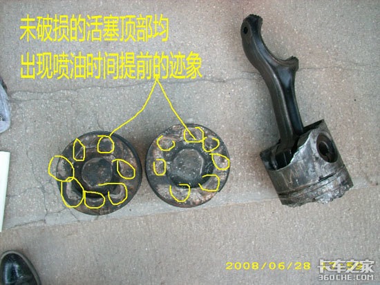 此发动机的未破损活塞顶部均出现喷油器提前喷油的痕迹(高压燃油冲刷积炭层形成)