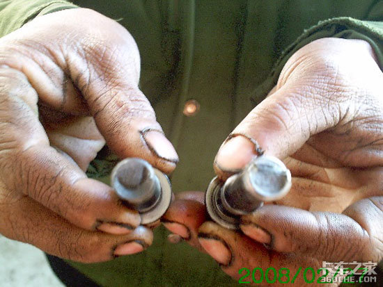 图上左边的连杆螺栓断口成纤维状分布,断口相对平整,有金属光泽,且与正应力垂直,断面上有人字形花纹。螺栓头部与连杆瓦盖台肩支承面的贴合处有明显的磨损台阶(与右图对比)。为先断裂的连杆螺栓。