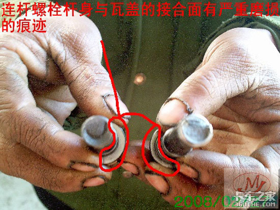 1、从上图可以知道,连杆螺栓与连杆瓦盖台肩支承面的贴合处有较严重的磨损,这种情况通常是在连杆瓦盖台肩支承面有毛刺或不平;或者工作中连杆螺栓与瓦盖台肩支撑面连产生缝隙才会出现。
