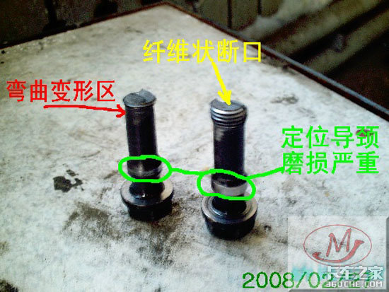 3、两个连杆螺栓的定位导颈均不同程度的磨损。其中脆性断裂的连杆螺栓的定位导颈磨损非常严重,表明连杆螺栓在其工作状态下,定位导颈与连杆瓦盖存在相对移动。这也就解释了在(分析2)中磨损凸台的形成原因。