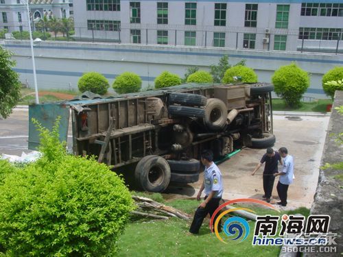 当日下午13时许,海口消防支队特勤二中队官兵接到报警,称海榆中线海口监狱内一辆大货车突然翻车,司机被困速到现场救援。特勤二中队立刻出动三辆消防车和12名官兵,到现场实施救援。