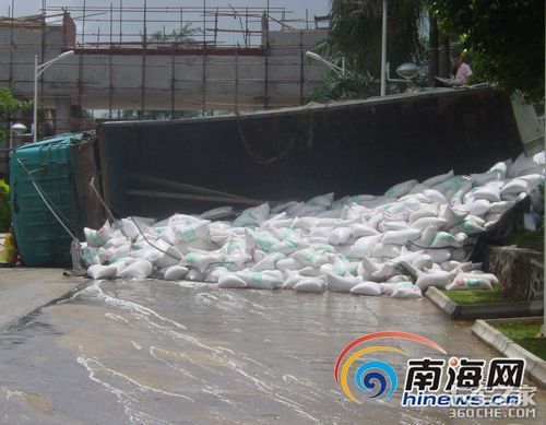 7月21日下午,海口监狱内一辆大货车突然侧翻致司机受伤,车厢里的大米散落一地,特勤消防官兵到场及时处置。